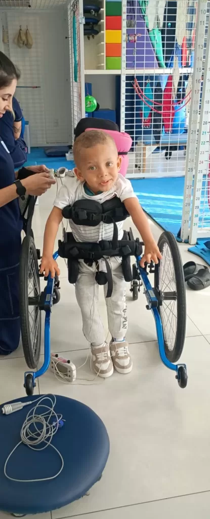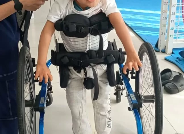 Com a ajuda do equipamento, o menino de apenas dois anos poderá ficar de pé