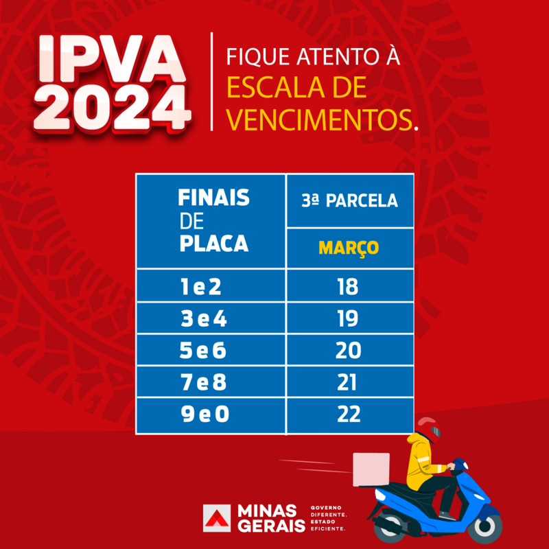 A terceira e última parcela do Imposto sobre a Propriedade de Veículos Automotores (IPVA) de 2024, em Minas Gerais, deve ser paga entre esta segunda (18/03) e sexta-feira (22/03), conforme os finais de placa. Assim como nas etapas anteriores, o pagamento pode ser feito via Pix ou diretamente nos terminais de autoatendimento, guichês e aplicativos dos agentes arrecadadores autorizados (Bradesco, SICOOB, Mercantil do Brasil, Caixa, Mais BB, Santander, Banco do Brasil e Itaú), sendo necessário apenas o número do Renavam do veículo.
